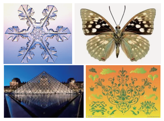 对称性,似乎司空见惯,很多存在于自然与艺术作品(如图2)中。对它们,我们或多或少都会有所感知。例如,我们会说,一个球具有对称性,一个正方形也具有对称性。然而,如何准确地给出对称性的定义,却好像又不那么容易。为了定义对称性,让我们从最直观的想象出发,看看对称性究竟意味着什么:考虑一个球,如果你闭上眼睛的时候,有人将它绕球心旋转任意一个角度,当你睁开眼睛时,你无法确定球是否旋转了,因为你观察不出它有任何改变;同样,一个不规则形状的四面体,当它绕形心旋转任意一个角度时,你很快就能看出它的改变。产生这种差异的原因就来源于球体与不规则四面体的对称性不同。