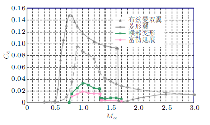 当前的文献资料中, 还没有对超声速双翼机飞行力学特性以及飞行控制问题研究的报道, 对于工程实用化的飞行器, 飞行力学和飞行控制乃是重中之重, 尤其加速/减速等变模态飞行时的动力学特性与控制问题, 这些也应当是下一步研究工作的重点。楠瀬等在研究中发现, 从亚声速到超声速, 布兹曼双翼的气动中心(焦点)并不像传统机翼一样由约25%移动到约50%弦长, 而是一直维持在25%$\sim$ 27%之间, 预示了良好的操稳特性[14]。除加减速外, 一些常见的机动过程, 如滚转、偏航过程中双翼机构型性能的鲁棒性也是亟待研究的。当前研究结果表明, 壅塞、迟滞等现象可以通过诸如采用前后缘襟翼、机翼变形、前后错动等方式解决。从工程角度来看, 前后缘襟翼方案最为实用, 且前后缘襟翼在起降阶段可以较好地改善飞行器的低速性能。当前研究中, 主要关注超声速双翼构型的超声速性能, 而真实的飞行器需要经历从速度零、高度零加速、爬升至巡航高度进行超声速巡航, 以及减速、下降、着陆等整个历程。研究表明, 目前的超声速双翼构型的低速失速迎角在20度左右, 下一步的研究中需要综合优化包括低速起降、爬升、超声速巡航等各阶段的性能。