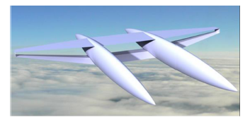 2008年, 日本东北大学的楠瀬课题组提出了基于超声速双翼构型的超声速旅客机方案。如图21所示, 整机采用超声速双翼飞翼布局, 四台发动机融合在双翼结构中。客舱在机体顶部, 与机翼融为一体, 双垂尾保证超声速飞行时的稳定性。该方案可将当前东京到纽约的飞行时间减少一半。