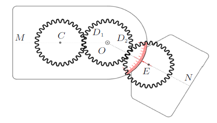 这样的设计保证了当$ON$轴和$OM$轴保持不同的偏角$\alpha $时,齿轮$E$总可以与齿轮$D_2$啮合。共轴设计将$OM$和$ON$的转角同时在齿轮$D_1$和$D_2$中反映出来,再将指针分别与$D_1$和$D_2$齿轮固接,就可以通过看两指针夹角的变化,直观地看出万向节两轴转角的差异。
