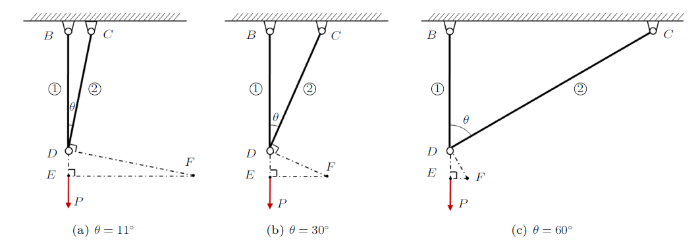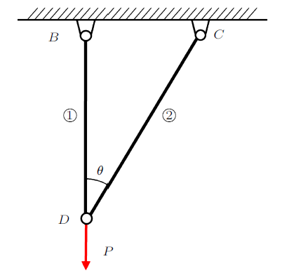 图1 是一个拉压杆件变形部分经典例题,竖直的杆1和与其夹角为$\theta$的杆2铰接于$D$,$B$和$C$是固定铰支座。由杆1和杆2组成的三角桁架结构在铰点$D$受到竖直向下集中载荷$P$的作用。