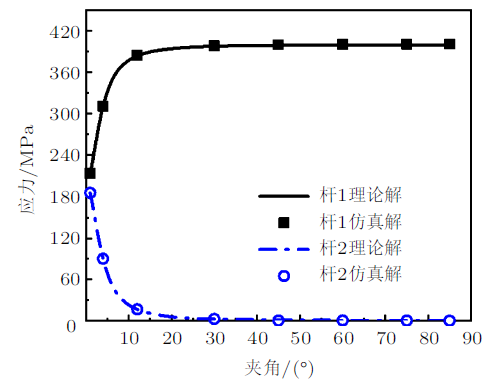 图5 展示了杆1和杆2的应力随夹角$\theta$的变化情况。根据小变形假设,杆2是应力为0的零力杆,而外载荷$P$的作用全部由杆1承担,其应力在数值上等于相同杆件单独承受外载荷$P$。