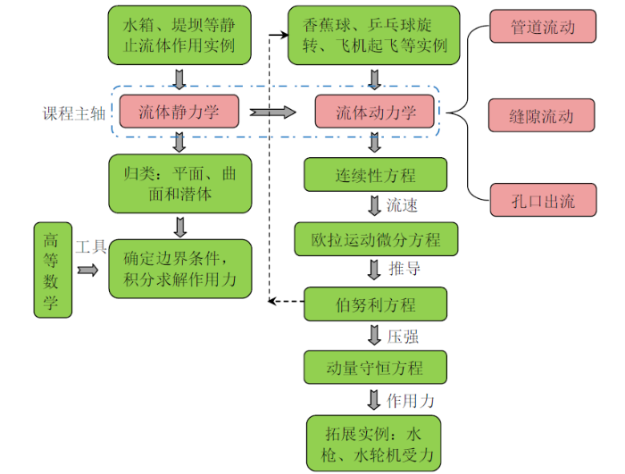 针对流体静力学,以日常中的水箱、油罐、管道、堤坝、挡水闸门等结构所受静压强实例入手。引导学生归类分析上述常见物体壁面类型,进而将平衡流体对壁面的作用力简化为对平面、曲面和潜体壁面三种典型形式;并以此为课程学习目标,系统分析平衡流体受力,结合高等数学知识建立平衡微分方程,确定流体受力边界条件,积分求解计算。该章看似较难,实际上通过梳理脉络关系,使学生理解研究对象,明确学习的目的和重点,借助先导课程中的高等数学工具将变得简单很多。