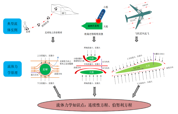 流体动力学是本课程最为重要也是较难的一章,内容涉及连续性、伯努利和动量守恒三大方程,而三大方程之间并非孤立理论,而是具有紧密的逻辑递进关系。因而在理论推导过程中,启发学生递进式挖掘的能力,主动捕捉知识点,这就要求教师从知识传授型教学模式向研究型教学模式转变[9]。在进行伯努利方程推导时,采用从欧拉运动微分基础方程出发,运用第二章流体静力学中的定常流动、压强全微分和流线方程进行逐步简化推导;并结合连续性方程求解不同断面速度,可解决伯努利方程中的速度未知量问题,而通过伯努利方程求解的动压强,又可以解决动量守恒中的未知压强问题;通过逐步减少求解过程的未知量,使学生由浅入深逐层获取流体核心知识点。在理论推导过程中,引入生活中的一些典型流体实例,进行案例式教学(图3),深入浅出地讲授理论知识,让学生有代入感和感知力;采用提问互动的形式丰富教学内容,如提出足球场中的香蕉球/乒乓球的旋转是如何产生的呢?你能解释飞机如何起飞的吗?如何规避航海过程的船吸现象?你能用所学三大方程解释杜甫《茅屋为秋风所破歌》中的"八月秋高风怒号,卷我屋上三重茅"吗?将流体动力学中的理论重点融入到常见实例中,用实例为载体讲授理论,加深学生对流体力学广泛应用性的理解,激励学生主动求知的欲望,提高学生学习兴趣。