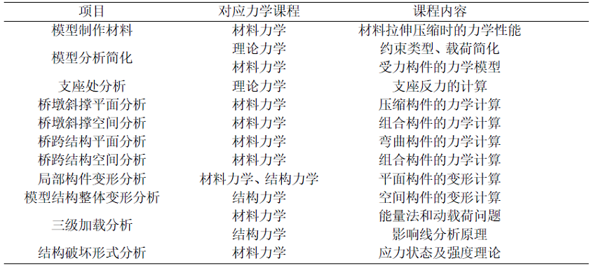 工科的力学课程体系中,三大力学(理论力学、材料力学和结构力学)占有十分重要的位置,也是工科教学的重点,学生对专业课程的理解程度是和本身数学及力学基础有最为直接的关系。以本次赛题为例,模型制作和分析过程几乎囊括了三大力学的大部分重点知识点,也是促进学生力学课程实际应用的一个较好的例子,其课程应用性剖析如表1所示。