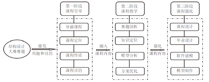其核心思想为:以赛题内容为中心,将所需基础力学课程知识点融入到相关专业课程教学,通过前期引导、中期教学和后期巩固三个阶段的教学过程,建立有效的基础力学课程体系,突破传统教学中学生学习兴趣小、涉及课程少、实践应用不明显的局限,达到从教师讲授为主到学生主动学习为主的教学目的。