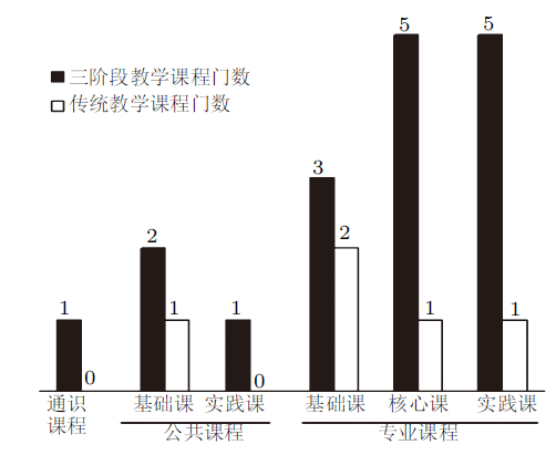 结合上述设计的三阶段教学形式,在本次疫情期间的线上教学过程中进行了初步尝试。教学初期,将赛题内容分解融入到认识实习讲座、学科概论和基础力学的第一课,充分调动学生的兴趣进行开课前的引导,强调基础力学的定位、性质和目的;按照表1设计的教学内容,在基础力学课程教学过程中设计实例进行剖析,建立力学模型并优化,分析和训练赛题的力学知识点,以设计竞赛方案的形式进行第二阶段的课程教学;在基础力学课内实践和专业课程中分析赛题材料的力学属性、在结构类课程设计中进行赛题模型的力学计算、在毕业设计环节设置相关课题进行设计和分析,以论证竞赛方案的形式进行第三阶段的强化训练。传统教学和三阶段教学方法力学课程体系对比如图5所示。