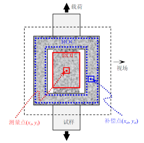 然而,大部分拍照手机成像镜头的焦距都固定不可调,其物理焦距通常只有几毫米。因此,拍照手机必须减小物距才能"放大"测试区域。而根据Sutton等[6]的研究,离面位移引起的测量误差与物距成反比关系。因此,当测试区域越小时,物距需要相应地减小以获得足够的图像信息,物体表面的离面位移引起的测量误差越大。因此,若要使用拍照手机成像系统进行高精度2D-DIC测量,必须消除由离面位移、成像元件自热以及镜头畸变引起的测量误差。为此,这里采用了一种基于参考试样的补偿方法[7-8],该方法被证明能在低质量的2D-DIC成像系统成功消除离面位移、成像元件自热以及镜头畸变等不利因素的影响。该方法的基本原理如图2所示,其核心思想是利用补偿点上记录的变形信息来消除测试点所含误差。该方法的具体实现可参考文献[7,8],这里不再赘述。