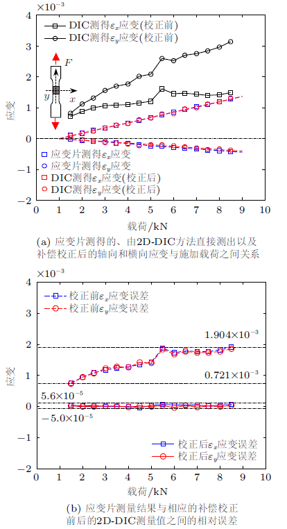 通过将1.5 kN到8.5 kN载荷下获得的15幅图片与1 kN载荷时刻记录下的参考图像进行相关运算可以获得相应载荷下由DIC方法测得的横向和纵向应变。图6(a)给出了直接由DIC方法测得的应变值、补偿校正后的应变值以及由应变片测得应变。如图所示,补偿校正前ROI内由DIC方法测得$x$方向和$y$方向上的应变值严重偏离应变片测得应变,而且两个方向上的应变值均大于0,这与单向拉伸应变状态严重不符。然而,补偿之后的应变值与应变片测量值基本吻合。因此,可以认为补偿之后由DIC测得应变结果是完全准确的。上述实验结果一方面说明了在工作距离较小时由手机成像系统直接测得应变结果严重偏离了真实应变状态;另一方面也说明基于参考试样的补偿法能有效地消除实验中可能存在的由离面位移、离面转动以及畸变等其他不利因素引起的测量误差。以应变片测量值作为参考应变值,从补偿前后由DIC方法测得的应变中减去应变片测量值即可认为是DIC测量值与真实应变值之间的相对偏差。如图6(b)所示,补偿校正之前,应变误差大体上随着载荷的增加而增加,且$x$方向和$y$方向上的应变误差值在每个载荷级处基本相等。相比之下,补偿校正之后的应变相对误差则在$-5.0\times10^{-5}$到$5.6\times10^{-5}$之间随机波动。$x$和$y$方向的平均误差分别为(22 $\pm$ 28) $\times10^{-6}$和(-2 $\pm$ 22)$\times$$10^{-6}$。可以看出,使用手机成像系统的2D-DIC方法在补偿校正之后测得的应变值是准确可靠的。