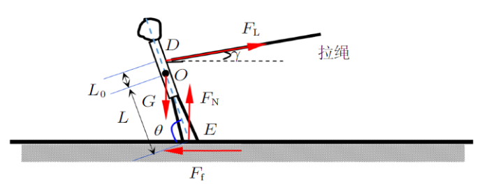 如图1所示为一对一拔河中一方的受力模型,为了简化,当人的姿态确定后将其视为刚体模型,受力包括:拉绳的拉力$F_{\rm L}$,地面对运动员的支撑力$F_{\rm N}$,重力$G$,摩擦力$F_{\rm f}$。并引入下列参数:拉绳与水平线的夹角$\gamma$,人体向后倾角$\theta$,人体重心$O$,绳拉力在人体上的作用点$D$,且$L_{0} =\left| {OD}\right|$,$L=\left| {OE} \right|$。