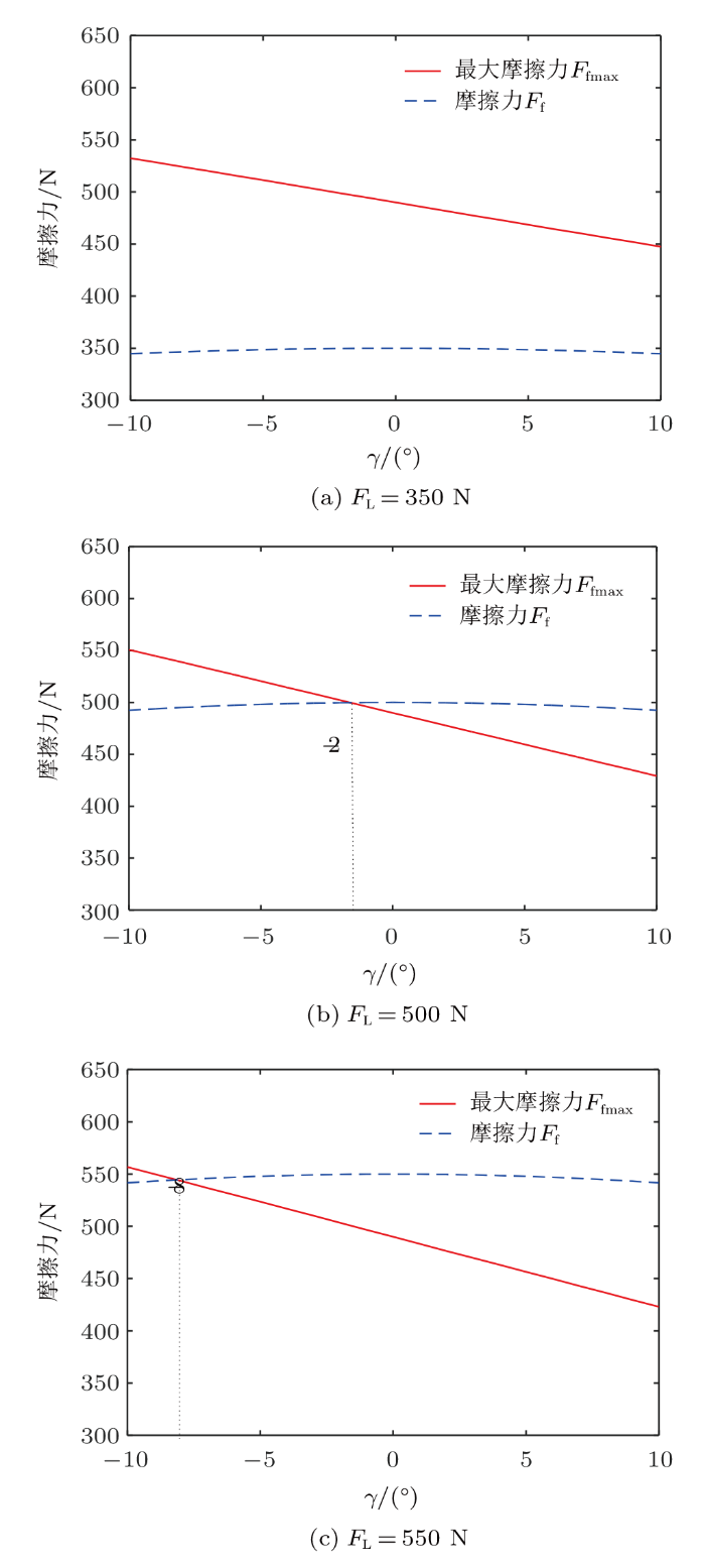 这里,$F_{\rm fmax } $表示最大静摩擦力,以$\mu$表示静摩擦因数,有$F_{\rm fmax } =\mu F_{\rm N} =\mu \left( {G-F_{\rm L} \sin \gamma } \right)$。一般情况下,$\gamma$取值很小,大约在$\left( {-10^\circ,10^\circ}\right)$之间,该区间内$F_{\rm fmax } $为减函数,意味着$\gamma $越小越有利于增加最大静摩擦力。从受力上看,当$\gamma <0$时,拉力$F_{\rm L}$使得正压力增加,也就增加了最大静摩擦力$F_{\rm fmax }$;相反,当$\gamma >0$时,拉力$F_{\rm L} $会减小正压力,从而减小最大静摩擦力$F_{\rm fmax }$。综合式(1)、式(2)和式(4),可知不被拉动时$\gamma $应满足条件