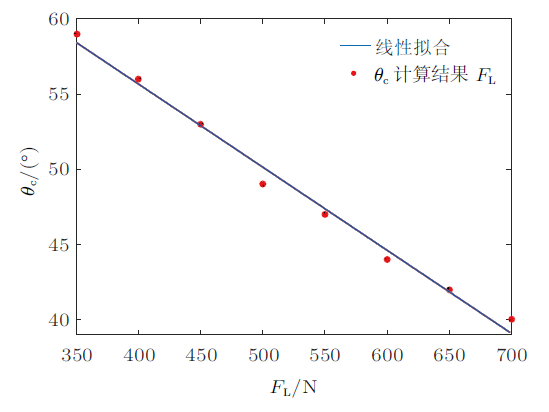 当$M_{\rm L} >M_{\rm G} $时就有可能输掉比赛。根据文献[3],$\theta $的取值范围大致在$\left( {30^\circ,90^\circ}\right)$,该范围内$M_{\rm L} $为增函数($\gamma $取值很小),$M_{\rm G} $为减函数。身体后倾可使$\theta $取较小值,达到减小拉力矩、增大重力矩的目的。由式(3)可知,当拉绳倾角$\gamma$和拉力$F_{\rm L} $确定后,可求出身体发生转动的临界倾角,记为$\theta_{\rm c}$。当$\theta $小于$\theta_{\rm c}$时,拉力矩小于重力矩,将不会被拉动。设队员身高为1.78 m时,因重心大概位于人体高度的56%左右,近似有$L=1$ m,$L_{0}=0.2$ m,因$\gamma $很小,令其为0,拉力取值设定在350 N~700 N之间,求解不同拉力下的$\theta_{\rm c}$,如图3所示。显然,在该取值范围内,$\theta_{\rm c} $随拉力$F_{\rm L}$近似线性递减,这说明拉力越大,保持平衡所需的$\theta $就越小。不过,也应注意到身体倾角越小,有可能导致$\gamma$为正,从而减小最大静摩擦力。因此,需要综合考虑$\theta $和$\gamma $的取值。