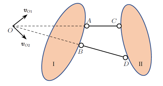(2)利用运动学理论(如基点法、速度瞬心法、速度投影定理等)及本文的两个定理求出其余结点(或刚片)的速度$\mathbf v_{i}$ (或角速度$\mathbf \omega_{i} )$。