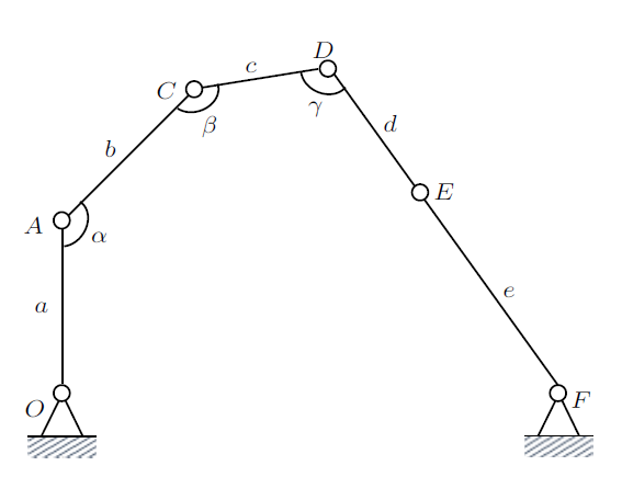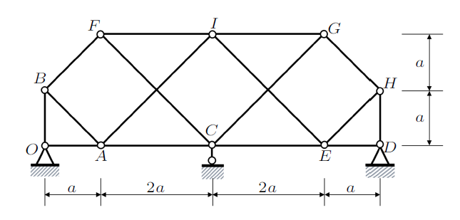 比较式(1)和式(2),得$\omega=0$,可知连接于$O$,$C$和$D$点(已知的不动点)的所有刚片和杆不能动,在此基础上易知其余杆都不动,即体系为几何不变体系。体系的计算自由度$W=-1$,有一个多余约束。