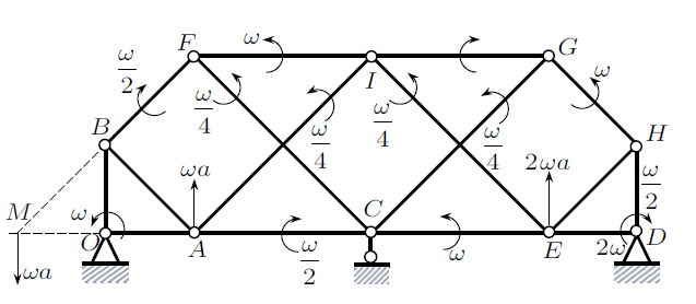 由于平行链杆连接,由定理二可知杆$AI$, $EI$, $CG$与杆$CF$角速度相等,均为${\omega/4}$。同理,杆$CE$, $FI$, $GH$与刚片$OAB$角速度相等都为$\omega $,可得$E$点速度为$2\omega a$,于是刚片$DEH$的角速度为