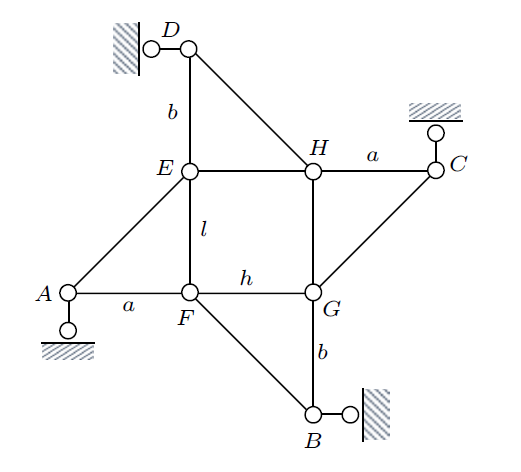 当$hl=4ab$时,$v$可不为0,即各结点能动,体系几何可变且绝对自由度$S=1$,体系计算自由度$W=0$,故有一个多余约束。当$hl\ne 4ab$时,$v$必为0,即各结点不动,体系几何不变且无多余约束。