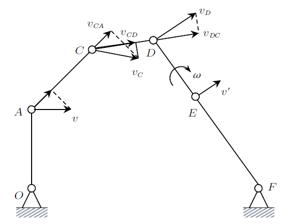 $$ \begin{eqnarray*} \omega_{OAB} =\frac{v}{a},\ \ \omega_{AC} =\frac{v}{2a},\ \ \omega_{CE} =\frac{{v}'}{2a},\ \ \omega _{DEH} =\frac{{v}'}{a} \end{eqnarray*} $$