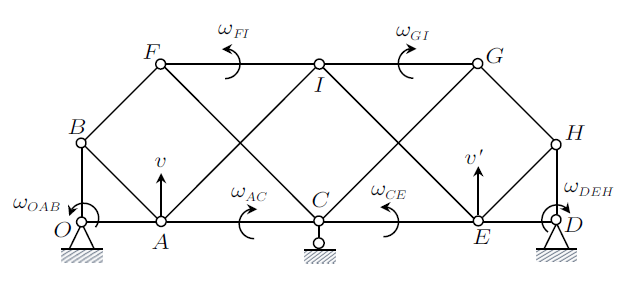 (1)假设体系可变,并按可能运动的方式,给定体系初始运动参数,如某一个或几个结点(或具有不动点的刚片)的速度$\mathbf v$ (或角速度$\mathbf \omega)$。