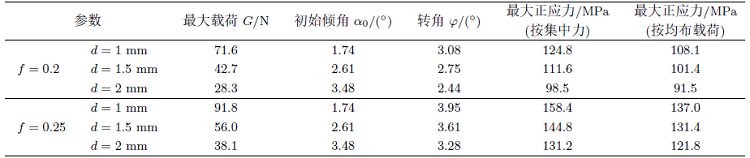 式中,棉线半径$a=0.5$ mm。显然,按均布载荷计算所得最大应力值更小一些。实际选用哪种计算方式需要根据棉线的粗细来决定。查阅文献可知,杨木、松木的拉伸屈服极限一般为88$\sim$118 MPa,可见按本文的理论计算结果,火柴杆的强度也在范围之内,所以可认为理论分析合理。但由于火柴杆选材、棉线与桌面的距离、火柴外伸长度等参数均人为选择,其结果会有一些差异。下面将几种选择的计算结果列于表1中。