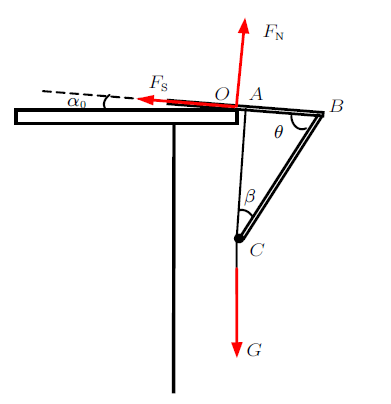 可见,只要火柴倾角$\alpha_{0}$小于火柴与桌面的摩擦角,该系统即属于自锁状态,即可保持平衡。其中$A$点为棉线的作用点,与$O$点位置很接近,设$OA=d$,$AB=l$,$AC=h$,此时$\angle CAB\approx 90^{\circ }$。则有