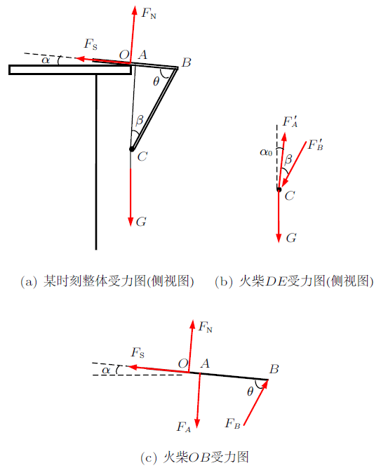 火柴$OB$发生弯曲变形使得尾部进一步翘起,但不会引起$C$处的角度变化。所以由图5(b)可得