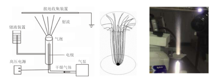 ... 尽管多喷头可以提高静电纺纳米纤维的产量,但在这一过程中仍存在针头堵塞、射流相互作用等问题.因此,近年来出现了许多无喷头静电纺丝方法来获得高产量的纳米纤维,它们均是利用高压电场在自由液体表面自发形成射流的纺丝方法,其装置的改进主要在于喷丝装置(即 储液装置)的改进.Yarin等[39]在带有永磁体的喷丝装置中的下层放置磁悬液,上层放置聚合物溶液,如图9(a)所示,其受法向磁场作用,磁悬液的垂直尖峰扰动了层间界面以及最上层聚合物层的自由液面,当外加电场时,自由液面的扰动受到电场的强烈拉伸产生多股 射流;Thoppey等[40]采用碗状喷丝装置和同心的圆柱形接收装置进行纺丝,如图9(b)所示,在高电压下,射流在自由液面上自发地 形成,并沿着碗状喷丝装置的圆周边缘排列;Jiang等[41]使用阶梯式金字塔形铜喷丝头进行静电纺丝,如图9(c)所示,纺丝时,喷 丝头的边缘同时形成多个射流;于昊楠[42]设计了一种碟形喷头的静电纺丝装置,如图9(d)所示,实验表明,圆周倾角为60$^\circ$ 的碟形喷头,批量化生产最为合适.本课题组首先根据气泡动力学原理提出了可批量生产纳米纤维的气泡静电纺丝技术,该技术采用高压静电和外加气流等作为动力来克服气泡的表面张力,从而产生多股射流,如图9(e)所示[43];接着在此基础上,将锥形聚合物喷嘴和 铜质储液装置相结合,提出了一种更高效制备纳米纤维的喷气静电纺丝技术,并采用转鼓作为接收装置,用来批量制备有序纳米纤维,如 图9(f)所示[44];最后,对纺丝装置进行了进一步改进,设计了三种不同的喷丝装置,如图9(g)所示,分别为具有圆柱切面(g1)、斜 切面(g2)和球切面(g3)的喷丝装置,结果表明球切面喷丝装置纺丝效果最好[45];同时,应用斜切面喷丝装置批量制备了用于伤口敷料的纳米纤维膜[46]. ...