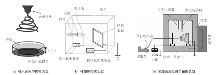 ... 超高比表面积的具有多孔结构的纳米纤维具有更高的吸附、渗透、光电及生物活性等特性,可广泛应用于吸附及分离介质、光电材料、生物医学 等领域[21],其制备方法主要是促使静电纺丝过程中的射流发生快速的相分离,从而使纤维具有多孔结构.Mccann等[22]将浸入 液氮浴中的接地硅晶片或铝箔作为接收装置,如图4(a)所示,液氮浴将导致聚合物和溶剂间的相分离,从而获得具有多孔结构的纤维;本课题 组[23]采用具有加热装置的接收板来获得多孔结构的纳米纤维,如图4(b)所示;Fashandi等[24]设计了一个温湿度调节箱,如 图4(c)所示,它通过调节气流的温湿度来控制纳米纤维多孔结构的形成. ...