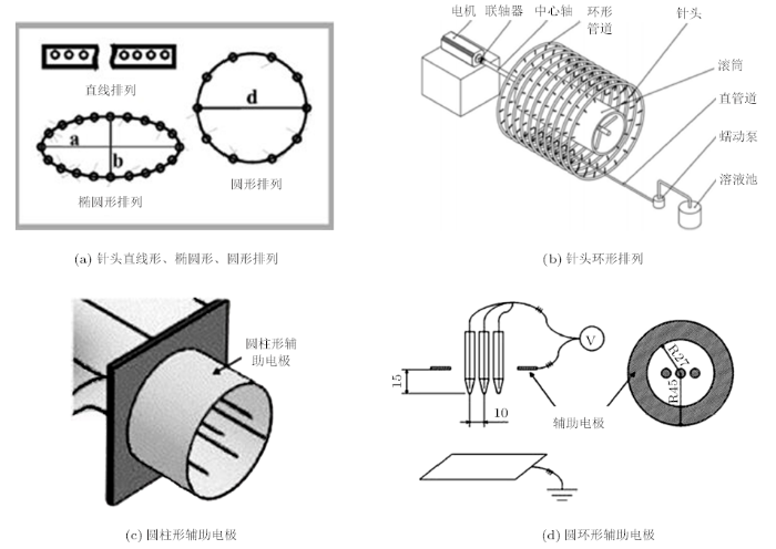... [34],但各射流表面的电荷所产生的库仑力会对射流路径产生影响,圆形排列生产出的纳米 纤维质量最好,直线形排列的纤维质量最差[35];杨责重等[36]在装置的环形储液管道上设有许多呈环形阵列分布的针头,且均指向环形管道中心的滚筒接收装置,如图8(b)所示,可大大提升产量.然而,这些多针头静电纺丝装置在其纺丝过程中由于相邻针头之间会产生电场的相互干扰,这不仅直接影响纺丝过程,而且会影响纳米纤维的性能,因此出现了在针头外圈添加辅助电极来克服这种缺陷的方法[37-38],如图8(c)和图8(d)所示,可有效减少纺丝过程中射流所受的干扰,从而减轻射流不稳定性,增加纤维产量. ...