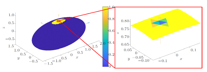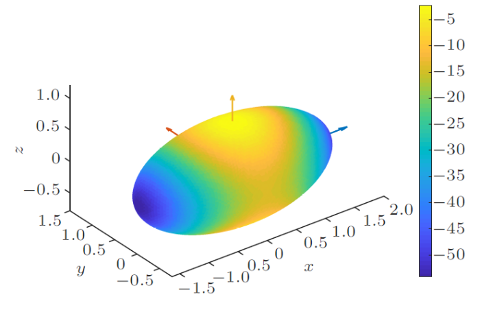 小行星2016 HO3目前暂没有公开的多面体数据,无法直接应用第1节中公式进行计算分析。本文为对其表面动力学环境进行粗略研究,先根据Li等[22 ] 给出的数据,将2016 HO3建模为58.8 m $\times$ 28.2 m $\times$ 28.2 m的三轴椭球,其自转周期为0.467 h,等效半径为18.0 m,密度为2 700 kg/m$^{3}$。以三轴椭球质心为坐标原点,长轴作为$x$轴,由于椭球另外两轴半径相同,任取一通过坐标原点且垂直$x$轴方向作为$z$轴正方向,并假设小行星自转角速度方向与该方向重合,再选取$y$轴使其构成右手直角坐标系。之后利用开源网格划分程序distmesh[23 ] 将小行星2016 HO3的椭球模型划分为具有6470个顶点,12 936个面的多面体,至此,可以使用第1节中公式对2016 HO3进行计算分析。此处虽可以不进行多面体网格划分,直接使用椭球模型对小行星2016 HO3进行研究,但为了表明方法对于任意外形小行星的通用性,仍对小行星2016 HO3的椭球模型进行多面体网格划分后再进行研究分析。