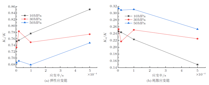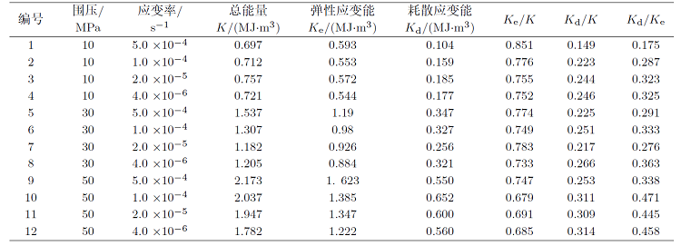 由不同应变率和围压条件下页岩能量变化曲线(图6)和页岩三轴压缩能量分析结果(表1)可知,页岩吸收的总能量是随应变率的升高而增大,由于应变率越高,裂纹发育时间越短,峰值强度随之增大,要使试样发生破坏则需要吸收更多的能量。在低应变率条件下,岩石倾向于沿薄弱面发生破坏,从而外界输入能量较少,这与大多数岩石室内三轴试验结果一致。随着应变率的降低,裂纹扩展发育时间充足,裂纹发育耗散的能量随之增多,即表现出耗散应变能$K_{\rm d}$占比随应变率的减小而增大,相反,弹性应变能$K_{\rm e}$占比与应变率之间呈正相关。弹性应变能是岩石峰后破坏的能量基础,随着应变率增大,峰后将会有更多能量以弹性应变能的形式释放出来,岩石脆性特征更明显,破坏特征更为剧烈。
