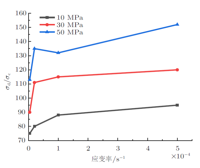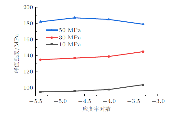 如图3所示,当围压为10 MPa和30 MP时,峰值强度随应变率升高而增大;但在围压为50 MPa的情况下,峰值强度随应变率增大呈现先增后减的变化趋势,峰值强度最大值在应变率为$2.0\times10^{-5}$ s$^{-1}$处取得。这与王礼立[9]得出的结论一致,岩石应变率效应受围压控制作用的影响,在低围压情况下,应变率效应敏感性高;在高围压情况下,应变率效应敏感性低。岩石破坏是由于内部微裂纹的发育、扩展、贯通导致的,在低应变率条件下,岩石内部裂纹扩展与应力增加协调发展;而在高应变率条件下,裂纹扩展滞后于载荷的增加,岩石吸收的能量积聚在内部,宏观上表现出抗压强度随应变率的增大而增大。关于高围压情况下,应变率效应丧失机理不是本文研究的重点,在此不进行过多论述。