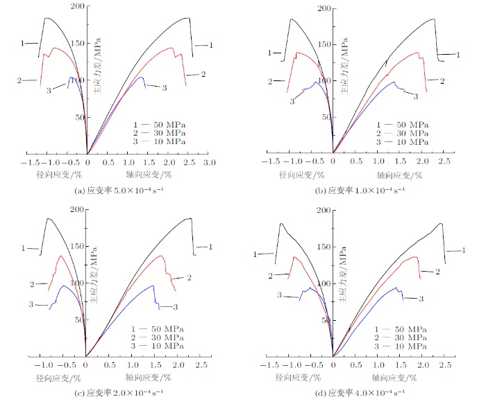 本次试验共设定三种不同的围压,分别为10 MPa,30 MPa,50 MPa,每组围压下取4种不同的应变率,分别为$5.0\times 10^{-4}$ s$^{-1}$,$1.0\times 10^{-4}$ s$^{-1}$,$2.0\times 10^{-5}$ s$^{-1}$,$4.0\times 10^{-6}$ s$^{-1}$。根据对动、静加载的定义,即当加载速率(应变率)在10$^{-4}$ $\sim$ 10$^{-6}$ s$^{-1}$的范围内为静态加载,当加载速率高于10$^{-4}$ s$^{-1}$时为动态加载[8]。本文是对岩石静态力学性质进行研究,故设计的应变率均低于10$^{-4}$ s$^{-1}$。
