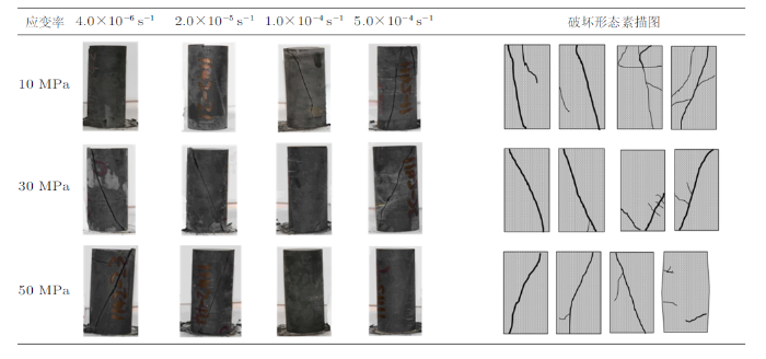围压为10 MPa时,在高应变率情况下,岩样劈裂成较大块的竖直碎块,岩样以劈裂破坏为主;随着应变率降低,试样破坏面呈现出剪切破坏特征,多条剪切裂纹贯穿整个试样并且许多微小裂纹相互交叉。围压为30 MPa时,试样破坏模式发生变化:在较高应变率的条件下(如$5.0\times10^{-4}$ s$^{-1}$和$1.0\times 10^{-4}$ s$^{-1}$),主要呈脆性剪切破坏;当应变率继续降低时,由脆性剪切破坏向延性破坏过渡,裂纹周围还出现一些次生裂纹,反映出试样塑性破坏的特征。围压为50 MPa时,应变率越高,破裂面的张开度越大,表明破坏时越剧烈;应变率越低,破坏后的裂纹越紧密,径向裂纹也明显增多;在应变率为$4.0\times 10^{-6}$s$^{-1}$时,试样出现了侧鼓、剪胀现象,表面出现了众多径向裂纹,是明显的塑性破坏特征。