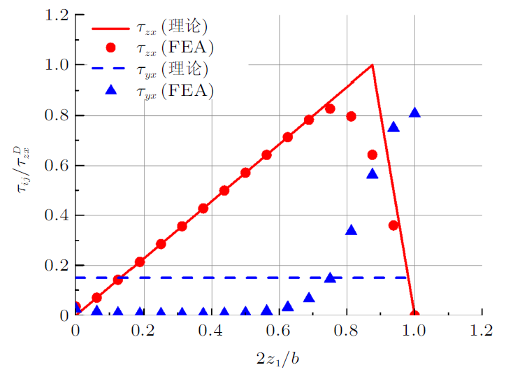 翼缘中心线位置$\tau_{zx} $和$\tau_{yx} $分布与比较