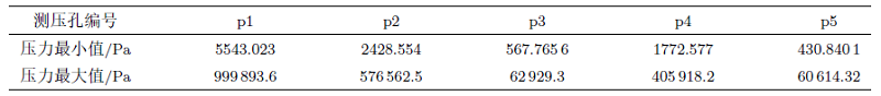 本设计中,测压孔p1位于驻点区域,0$^\circ$ 攻角附近时,实际上测压孔p2,p4位于迎风面,测压孔p3,p5位于背风面,同时位于迎风面或背风面的测压孔具有相似的压力分布特征,即p2,p4具有相似的压力分布特征,p3,p5具有相似的压力分布特征,仅在数值上存在差异,可以互相作为冗余使用。冗余配置测压孔的FADS系统显著提高了对于故障的鲁棒性;而且能减小系统噪声的影响。基于测压孔p2和p4及测压孔p3和p5的相对位置关系,并非越接近越好,因为要考虑模型的整体输入量的影响[14]。下述章节将对不同的故障测压孔是否进行修正进行系统比较,为了改进冗余配置以防发生故障对算法精度的影响。表1给出了FADS工作域段内各个测压孔的压力合理范围。