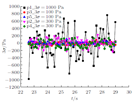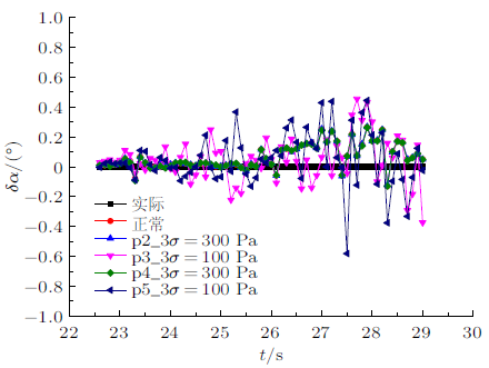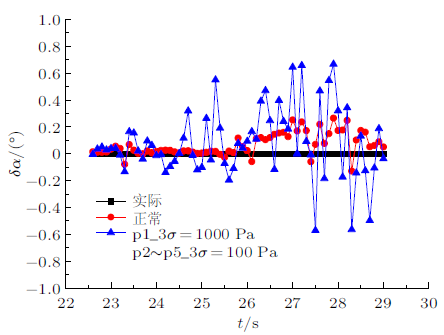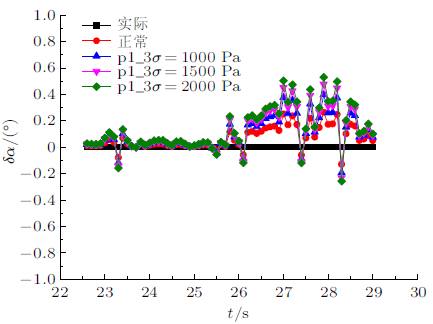 将$3\sigma=1000$ Pa,1500 Pa,2000 Pa正态分布随机误差加入测压孔p1原始压力数据中得到的攻角误差分布如图14所示,可以看出单独驻点压力对算法精度的影响误差在0.2$^\circ$~0.4$^\circ$ 之间;将$3\sigma=100$ Pa,300 Pa正态分布随机误差加入测压孔p2~p5的原始压力数据中得到的攻角误差分布如图15所示,可以看出测压孔p2~p5的单独压力偏差对算法精度的影响误差在0.1$^\circ$~0.25$^\circ$之间。在本文设定的误差限范围内,单一测压孔误差对于算法精度的影响并不显著,说明该算法适用性较好。同时综合p1~p5各个测压孔的误差限分析如图16所示。在p1_3$\sigma =1000$ Pa,p2~p5_3$\sigma=100$ Pa的误差源下,可以看出压力对算法精度的影响误差在0.2$^\circ$~0.6$^\circ$之间,对算法精度有较大影响。所以,实际测压孔故障对算法精度的影响及各个测压孔容许的误差限需求,需要根据所需精度需求及硬件设备进行系统验证。