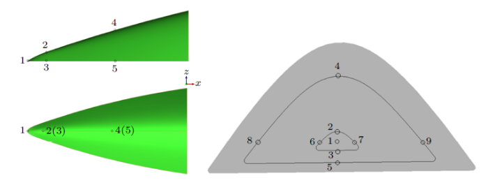FADS系统通过飞行器表面测压孔测量表面来流压力,根据建立的气动模型反推得到飞行参数,测压孔配置及压力准确性对FADS系统的实现精度至关重要,尤其对于本文建立的无物理模型的BP (back propagation)神经网络模型更加重要。该方法略去了气动建模的过程,但测压孔的选取需要基于气动理论,应配置在与相应飞行参数敏感的位置。针对尖楔外形特点及实际需求,根据相关的空气动力学理论,该FADS系统配置了9个测压孔。本文仅涉及位于攻角平面的5个测压孔,用于马赫数、攻角及静压的建模及解算,对于位于侧滑角平面的测压孔及侧滑角的解算,本文并不涉及。FADS系统的测压孔具体配置方案如图3所示。