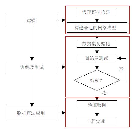 针对尖楔前体FADS系统的特点及人工神经网络的非线性建模能力,本文采用基于BP神经网络建模技术建立了FADS系统的解算模型及算法,算法流程框图如图7所示,主要流程包括模型构建、算法测试验证及脱机算法实现等。该算法结构包含输入层、(一个或多个)隐含层和输出层,层与层之间依靠神经元互相传递信息,实现从输入到输出的高度非线性映射,但各层的神经元之间是独立的。该学习算法的基本原理采用多层前传算法,实现模式前向传播,误差反向传播。最终目标是通过训练数据集得到权值与阈值的系数矩阵,使得网络输出与期望输出间的均方误差值最小。同时,本文建立的网络结构隐含层采用双曲正切函数作为激活函数,输出层采用线性函数实现参量的输出。