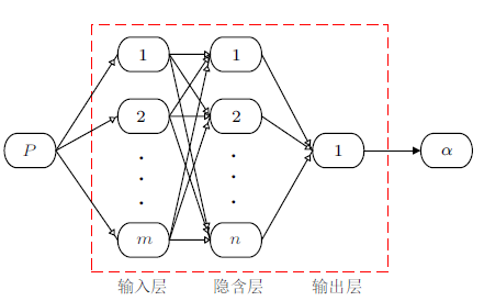 典型的含有双隐含层的多输入单输出神经网络模型如图8所示,根据不同文献对输入层的定义,本文将输入层单独作为一层,并纳入神经网络总体结构中。输入参量$P$即为各个测压孔的压力数据,包含驻点压力数据时,输入数据为$p_{1}\sim p_{5} $;不包含压力数据时,输入数据为$p_{2} \sim p_{5}$。$n$为隐含层神经元数目,$m$为输入层单元个数(数据经归一化处理后的输入)。