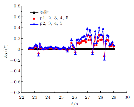 驻点作为反映流动信息的重要区域,与飞行状态信息密切相关,目前所有涉及FADS系统解算的模型一般都将驻点压力作为输入参量。但实际工程应用中,驻点压力由于种种原因可能难以得到,如尖楔前缘半径很小,在前缘表面开测压孔结构上无法实现。因此,本节对驻点压力对模型及算法精度的影响进行了评估。神经网络模型及算法均采用上节介绍的基于BP神经网络的多输入单输出算法结构。当建立的针对攻角的单输出网络结构输入量包括驻点压力时,输入量为$p_{1}\sim p_{5}$;当建立的针对攻角的单输出网络结构输入量不包括驻点压力时,输入量为$p_{2}\sim p_{5}$。对于图7所建立的神经网络,得到了驻点压力对算法测试精度的影响如图9所示,$\delta\alpha$表示攻角解算值与实际数值的偏差。