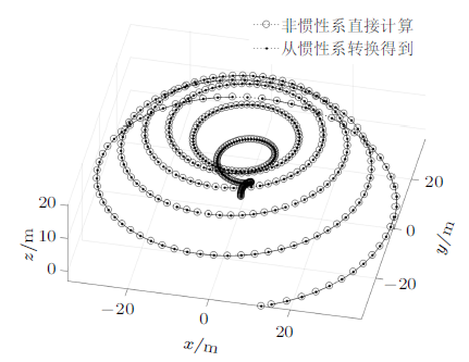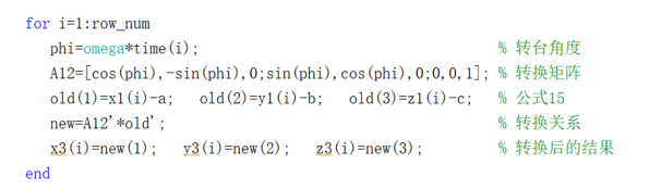 其中$\left({x_{1} (i)} \ \ {y_{1} (i)} \ \ {z_{1} (i)} \right)^{\rm T}$表示惯性系中第$i$个点,$\left({x_{3} (i)} \ \ {y_{3} (i)} \ \ {z_{3} (i)}\right)^{\rm T}$是转换后得到的非惯性系中第$i$个点。在Matlab中,A12'表示对A12进行转置。