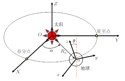 假设地球绕太阳为圆周运动,为简单设365天。在日心坐标系$OXYZ$中,地轴($z$轴)的单位矢量为$(0, -\sin \theta, \cos \theta)^{\rm T}$,$\theta=23.5^{\circ}$ (图12)。设时间为春分点之后第$t$小时,地球球心运动至