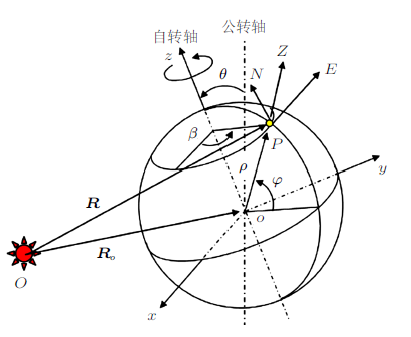 其中$R_{\rm e} $为地球半径,$\varphi $为当地纬度,$\beta =2{\pi}t/24$为地球自转角度。