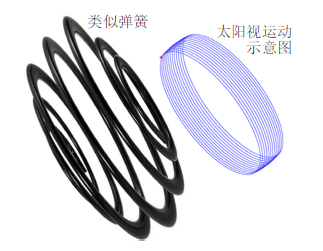 我们看到的太阳视运动,就是式(21)中的$-(\mathbf R)_{\rm G}$。式(21)右边每项都为已知函数,代入数据后太阳视运动轨迹见图14,显示了全年特殊日期的太阳视运动轨迹:夏至当天轨迹偏北方,冬至当天轨迹偏南方,其他时间视运动轨迹会在夏至和冬至轨迹之间缓慢地变化,春分当天轨迹居中间。我们看不到水平面下方的太阳视运动轨迹,但仍画出。注意每一天的视运动轨迹并不封闭,因此全年的太阳视运动轨迹则很像一个弹簧,但是这个弹簧两端半径微小,中间半径略大,不过差距没有图中弹簧那么明显(图15),另外视运动轨迹很密集,在夏至与冬至之间有365圈。