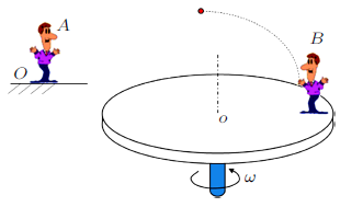 两位观察者,$A$在地面上(惯性坐标系),$B$在匀速转动的转盘边缘(非惯性系)。$B$随手抛出一物体,求两位观察者看到的物体运动轨迹(图3,不考虑空气阻力)。