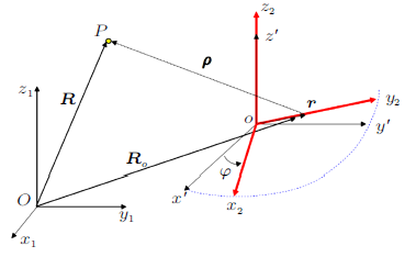 以式(5)和式(6)为基础可以得到更一般的关系。假设$Ox_{1} y_{1} z_{1}$是基准参考坐标系(如动力学中的惯性系),$ox'y'z'$是平动坐标系(坐标系始终与基准坐标系平行),$ox_{2}y_{2} z_{2} $是任意的动系(如动力学中的非惯性系),$ox_{2} y_{2} z_{2}$初始时刻与$ox'y'z'$重合,转动后用三个角度(如欧拉角$\psi,\theta,\varphi$)来表示;$P$是动点,在基准坐标系中矢径为${\mathbf R}$,相对运动的矢径为${\mathbf \rho }$,动系原点的矢径为${\mathbf R}_{O}$ (图2)。
