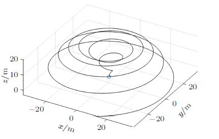 $ \begin{eqnarray*} &&m=1 {\rm kg},\ g=9.8 {\rm m/s}^{2},\ \omega =10 {\rm rad/s}\\[-2mm]&& r=1 {\rm m} a=1 {\rm m},\ b=2 {\rm m},\ c=3 {\rm m},\ v_{x0} =0\\[-2mm]&&v_{y0} =-1 {\rm m/s},\ v_{z0} =30 {\rm m/s} \end{eqnarray*}$