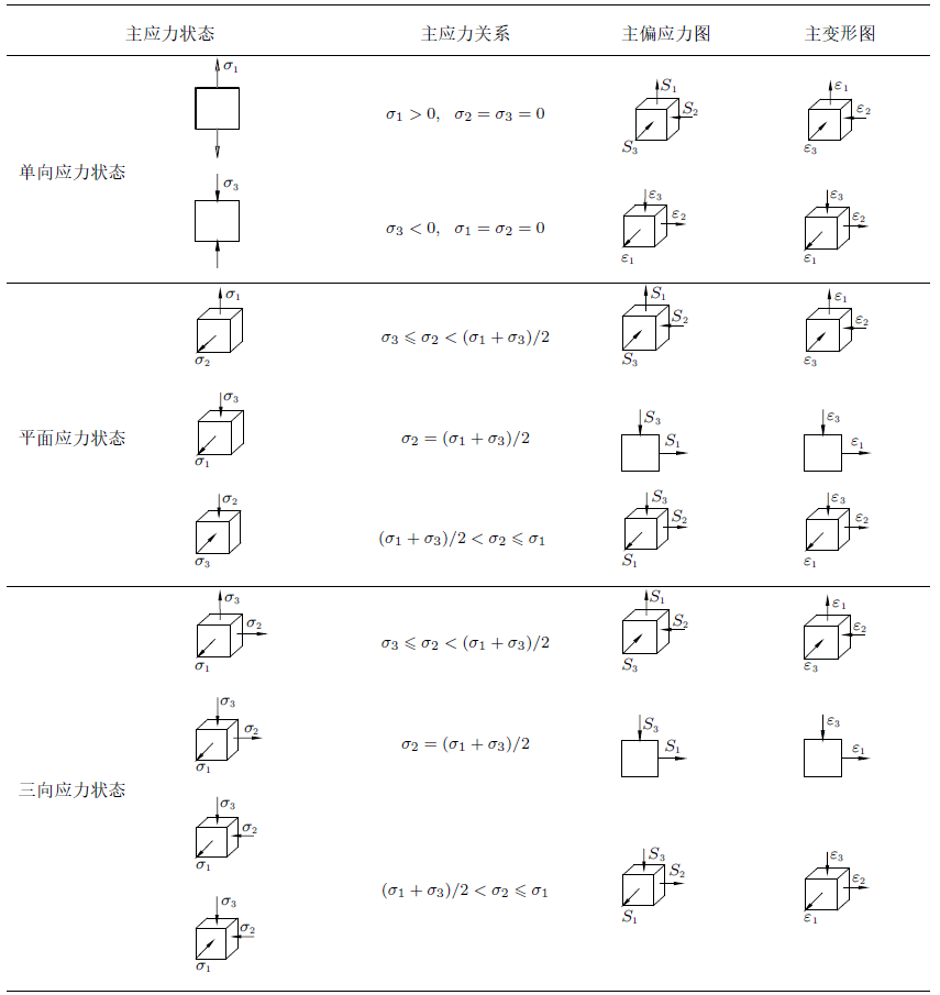 式中,${\rm d}\varepsilon_{1}^{\rm p}$,${\rm d}\varepsilon_{2}^{\rm p}$和${\rm d}\varepsilon_{3}^{\rm p}$分别第一、第二和第三塑性应变增量。式(11)表明,$\mu_{\sigma}$决定了3种塑性变形类型:一向拉两向压;一向压两向拉;一向拉一向压。一点的应力状态有9种形式,根据上述理论,分析9种应力状态对应的变形类型,对应关系总计23种,见表1 。
