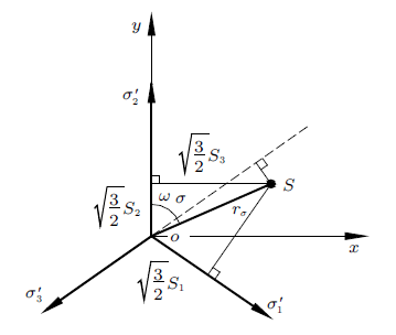 (9) $\begin{eqnarray} \left. \begin{array}{l} r_{\sigma }=\sqrt{x^{2}+y^{2}}={\sqrt 3 \tau }_{8}=\sqrt{\dfrac{2}{3}} \sigma_{i} \\[3mm] {\cot}\omega_{\sigma}=\dfrac{y}{x}=\dfrac{1}{\sqrt 3}\dfrac{2\sigma_{2}-\sigma_{1}-\sigma_{3}}{\sigma_{1}-\sigma_{3}}=\dfrac{1}{\sqrt 3 }\mu_{\sigma }\\ \end{array} \right\} \end{eqnarray}$