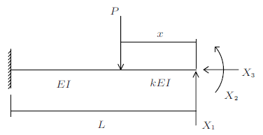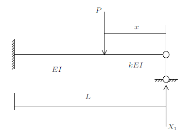 为方便计算,利用结构的对称性,取其半结构进行分析,如图11所示,$EI$为杆的抗弯刚度,$k$为比例系数,$x$为抗弯刚度为$kEI$的等截面杆的长度。